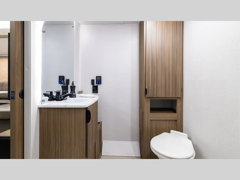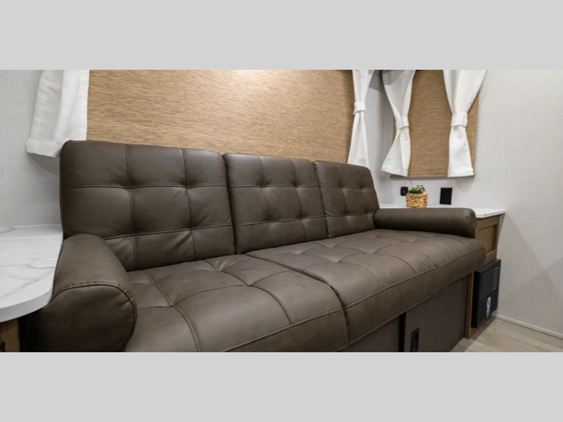 There are stylish window shades inside, along with TFL cabinet doors, upgraded backsplash, plus elegant curtain rods and curtains to make you feel more at home. You will also appreciate some of the best-in-class features such as, an enclosed Accessibelly for added protection, exterior accent lighting, a powder coated I-beam frame, and seamless holding tanks.