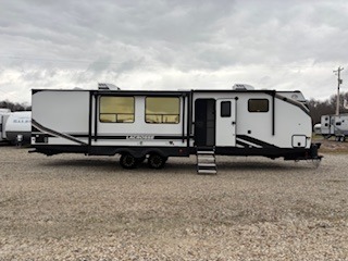 The exterior comes outfitted with a universal docking station, an electric LED-lit awning, heavy-duty slam-latch baggage doors, a doggy "D" ring to secure your pets outside, and a Winegard TV antenna. There are quite a few appliances that you'll find yourself using just about every day, like the Smart TVs, the  soundbar , the three burner cooktop and 30" microwave oven for all of your cooking needs, plus a 30,000 BTU high-capacity gas furnace and two 15,000 BTU air conditioners so your inside temperature can keep your comfortable both day and night.